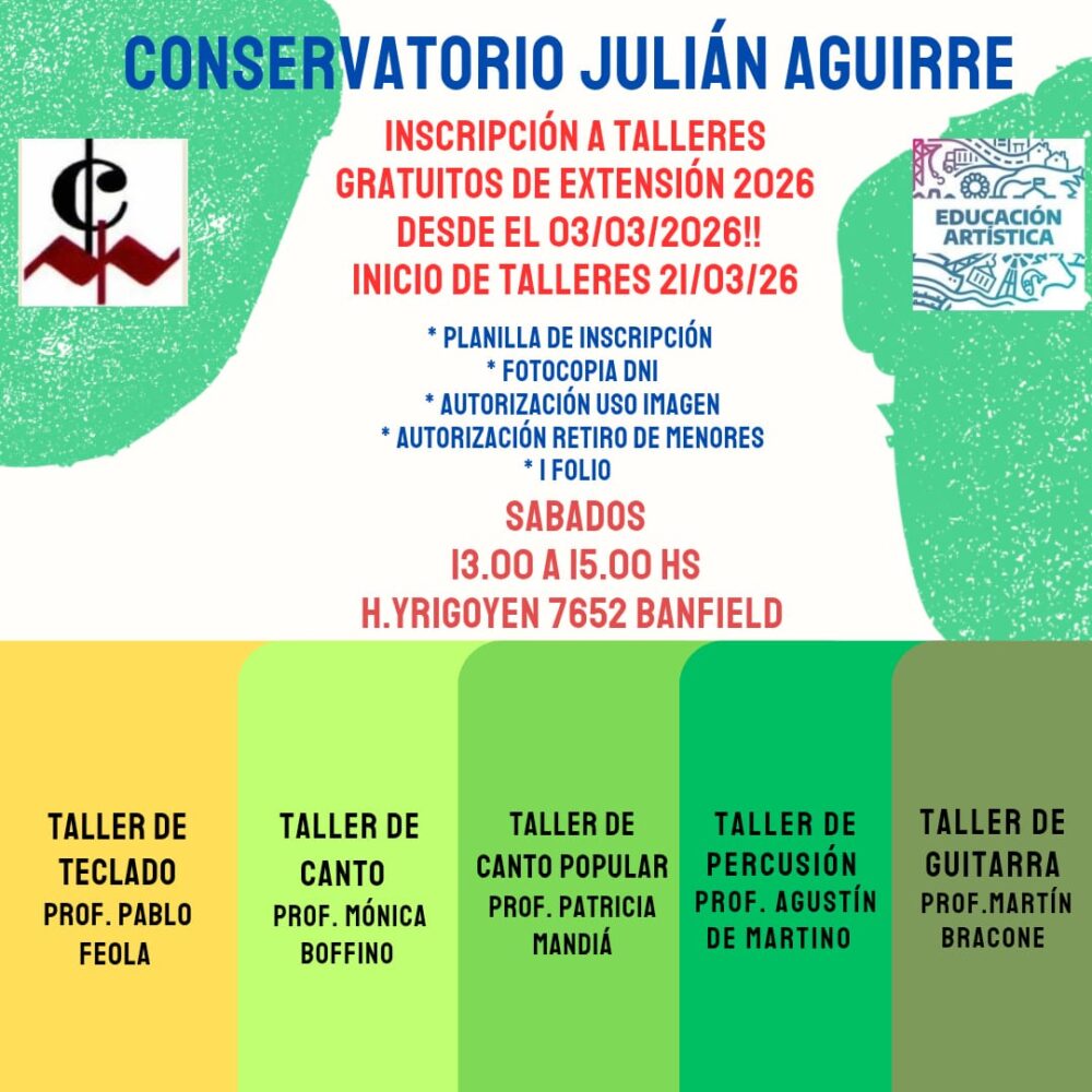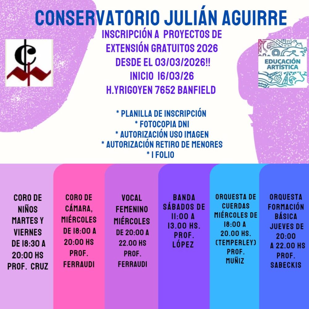 Entrega de documentación y confirmación de inscripción: del 02 al 07/03 (sólo para los niveles/talleres e instrumentos donde haya vacantes). Ver documentación requerida para Ingresantes AQUI